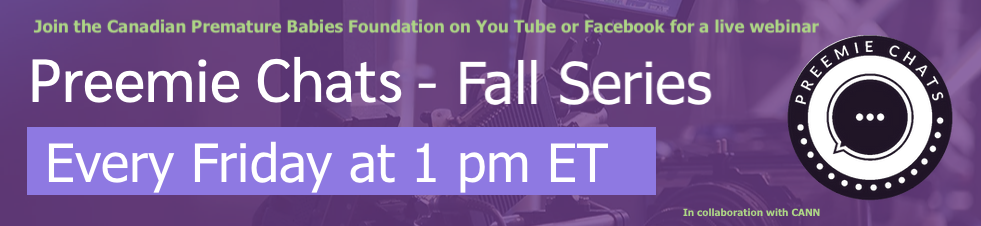 CANN is once again proud to collaborate with the Canadian Premature Babies Foundation (CPBF) for the fall series of their live webinars – Preemie Chats. Join the CPBF live every Friday at 1 pm ET to chat with experts, researchers and parents from all over the world on Facebook or YouTube or Twitter. Missed the last Preemie Chat? Visit the CPBF website to watch a past session – https://www.cpbf-fbpc.org/videos.
